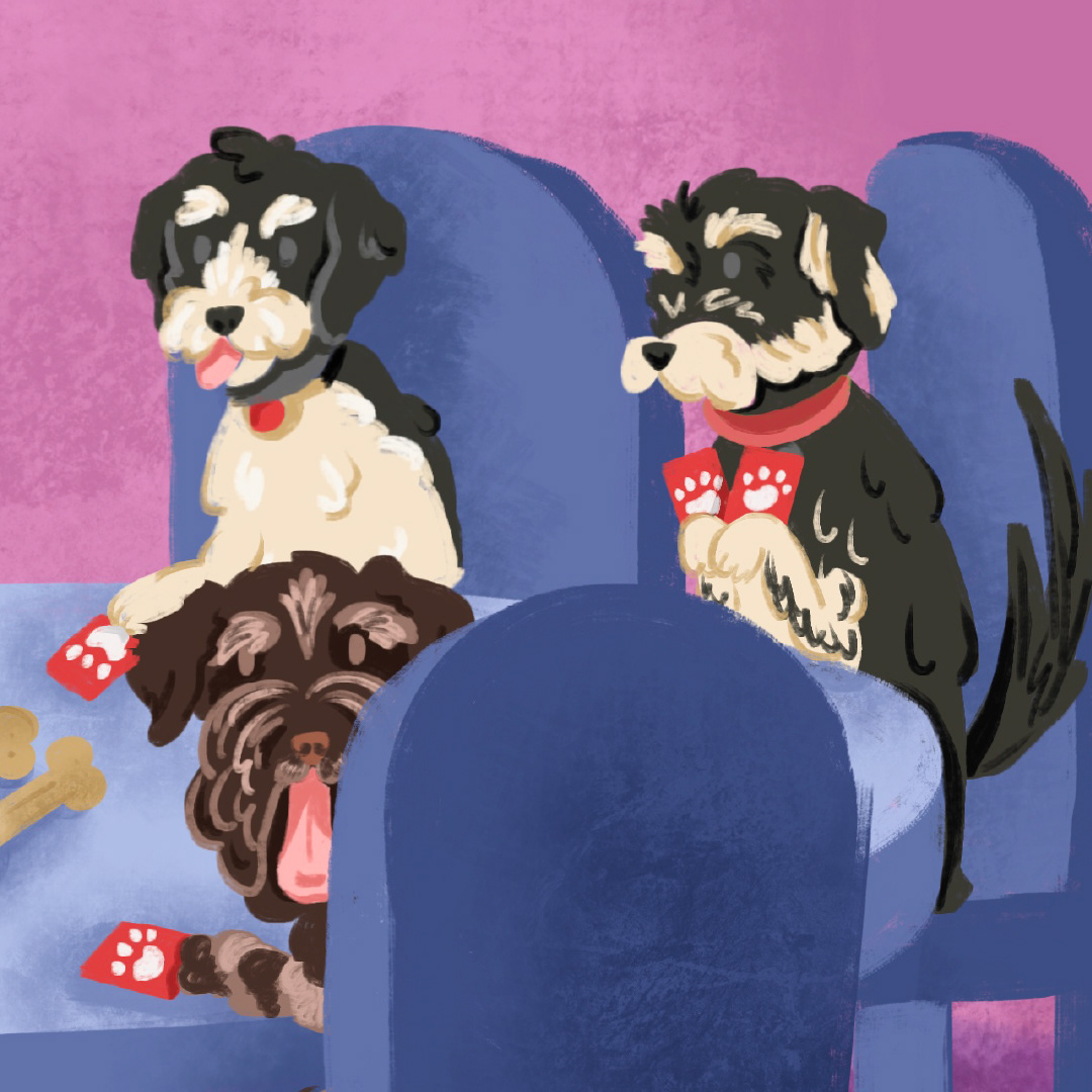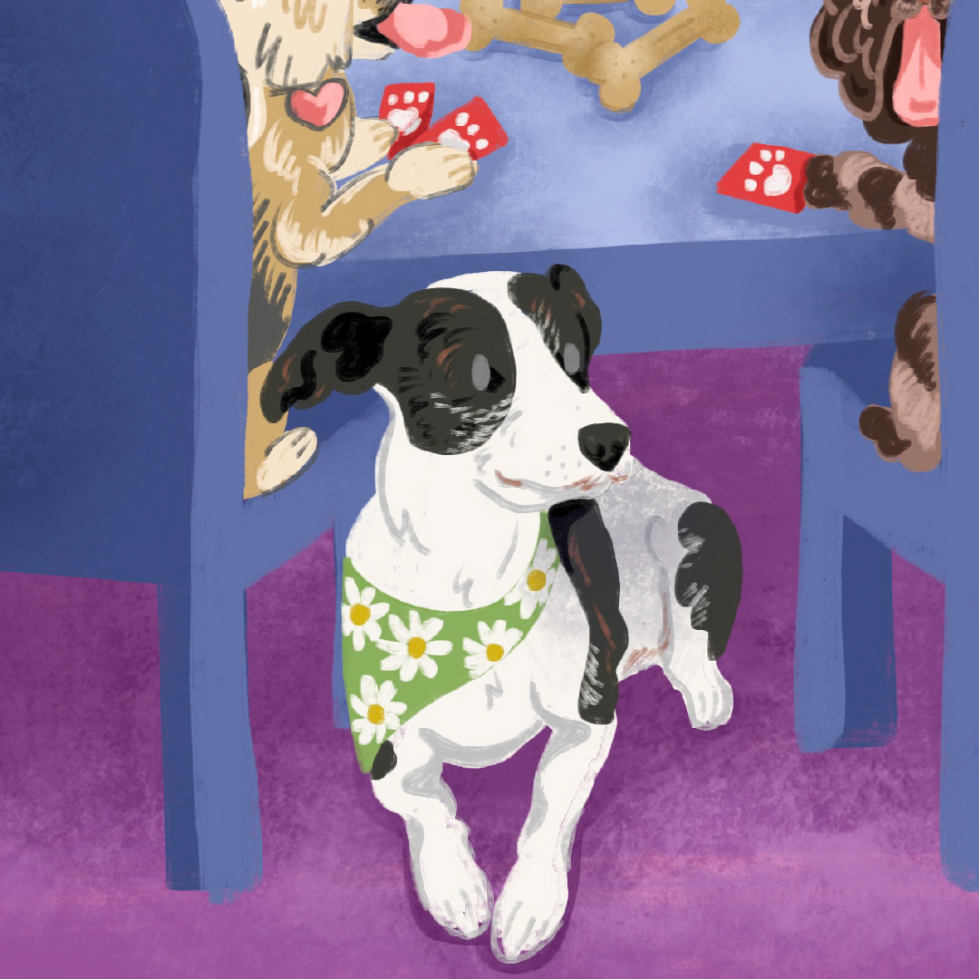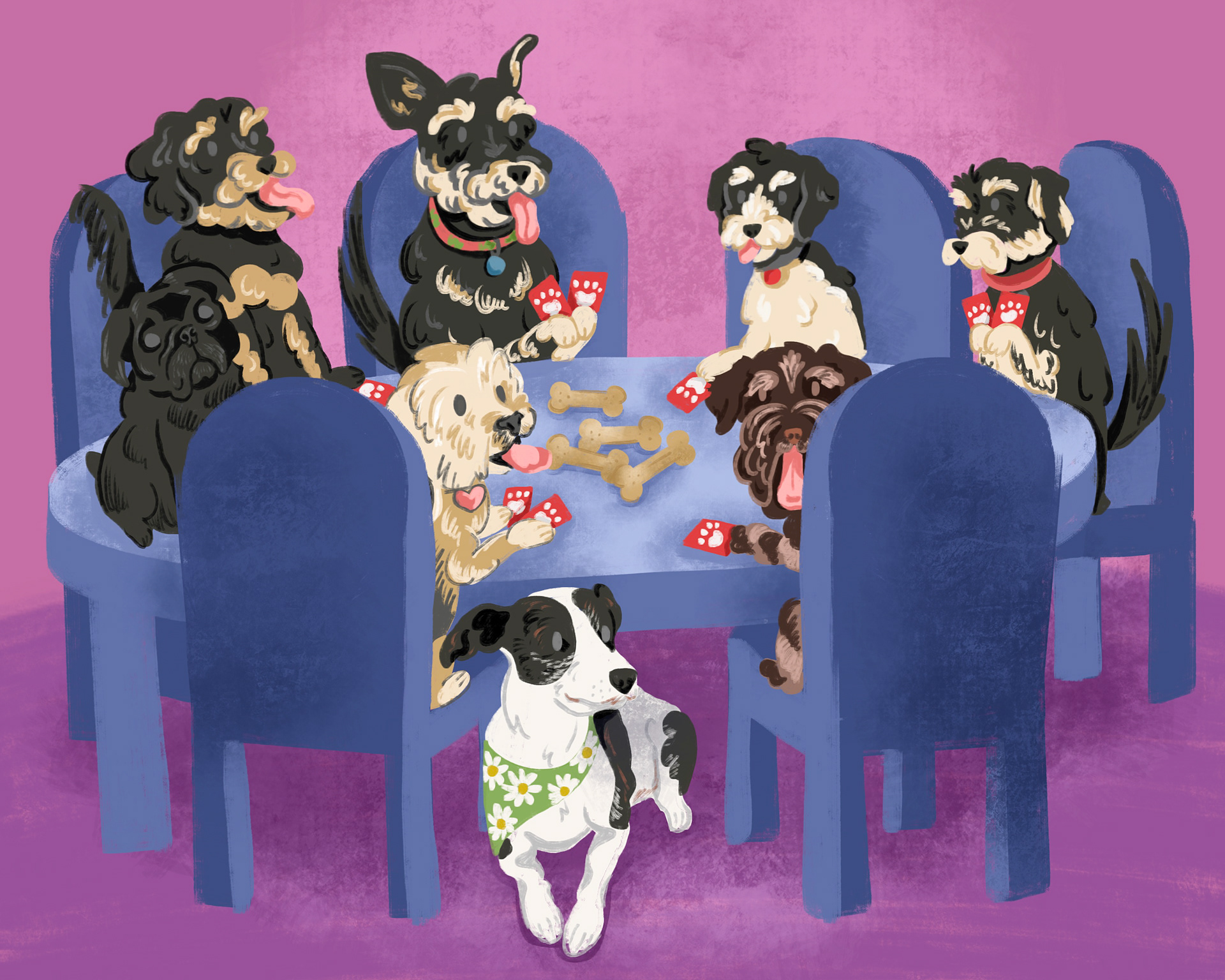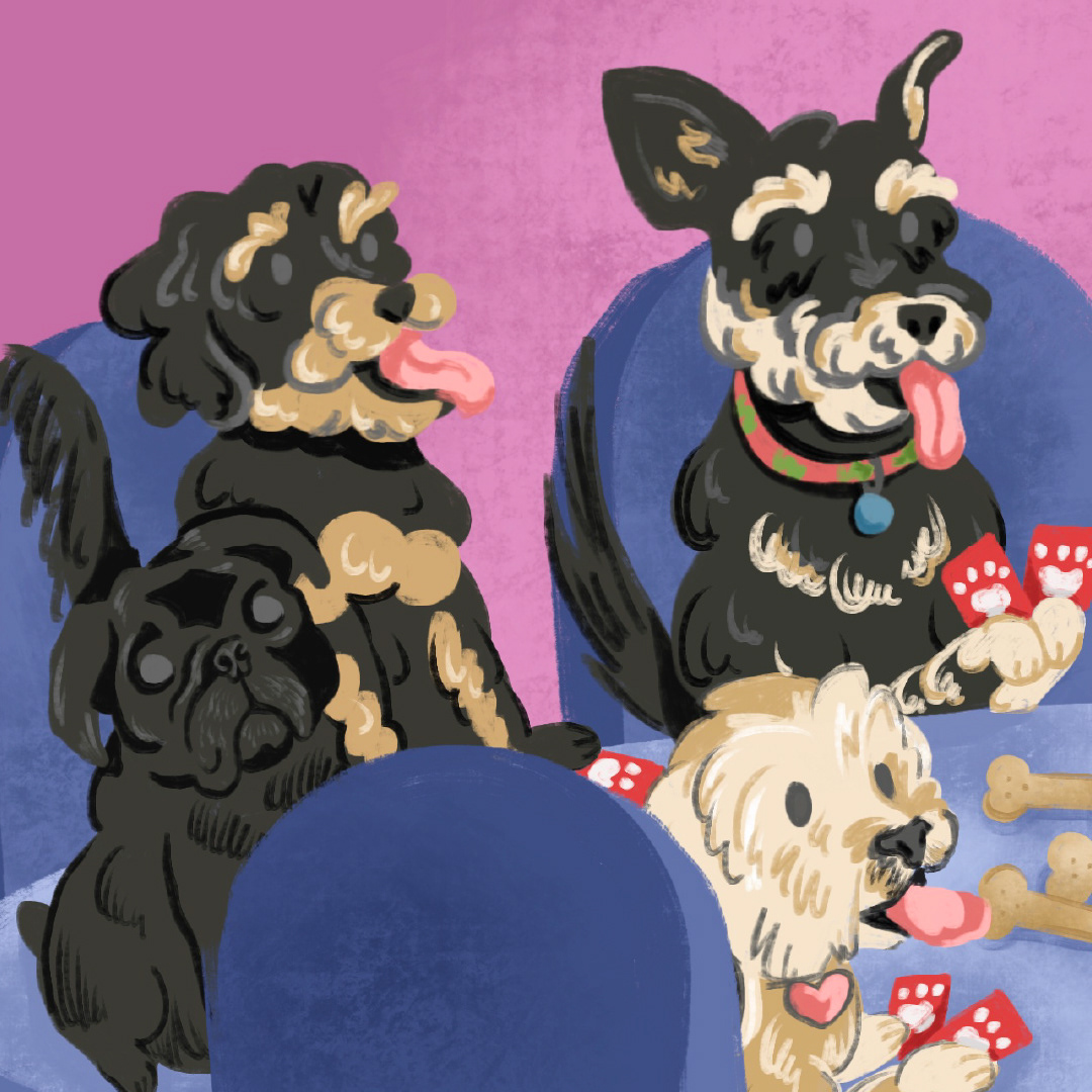 Inspired by the famous "dogs playing poker" paintings, artist Emily Hargis created this digital painting featuring her dog Dottie and all her puppy friends.