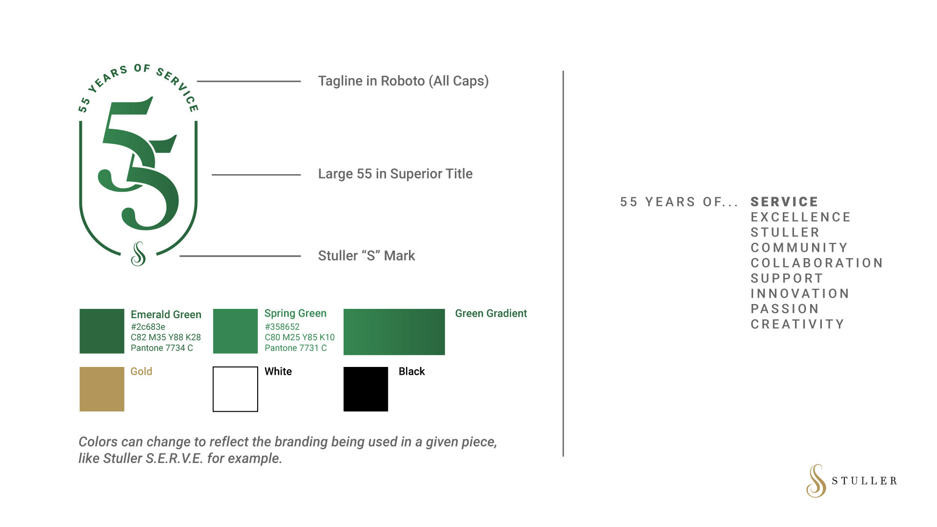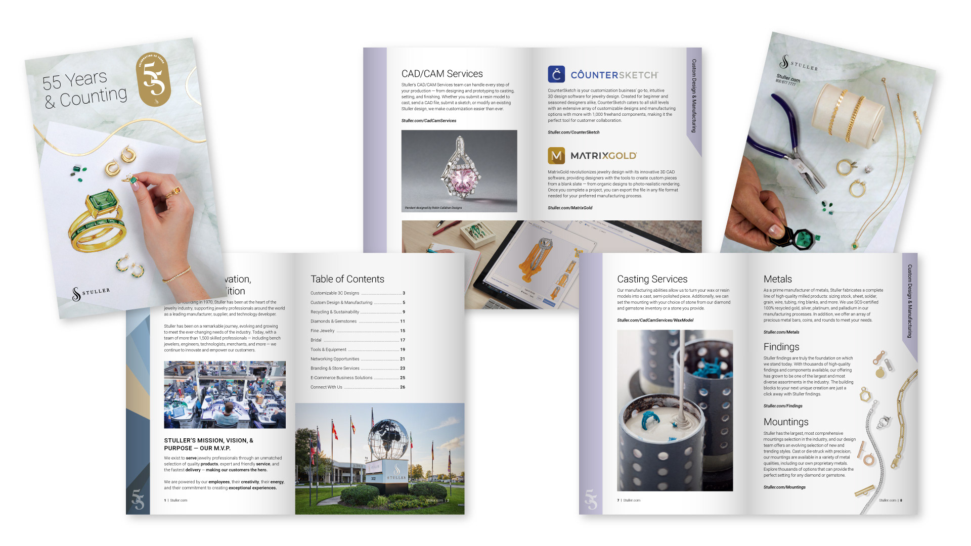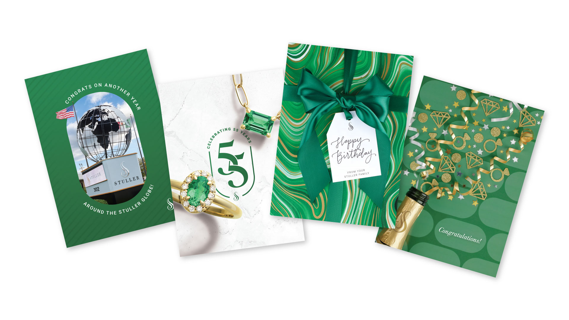 Stuller, an international jewelry manufacturer and distributor based out of Lafayette, Louisiana, celebrated its 55th anniversary in 2025. To commemorate this impressive birthday, the company tasked its internal marketing team with creating a logo for the occasion. This logo and surrounding creative were used for multiple deliverables throughout the year including: corporate greeting cards, mouse pads, stickers, lanyards, calendars, screensavers, swag bags, brochures, and much more.