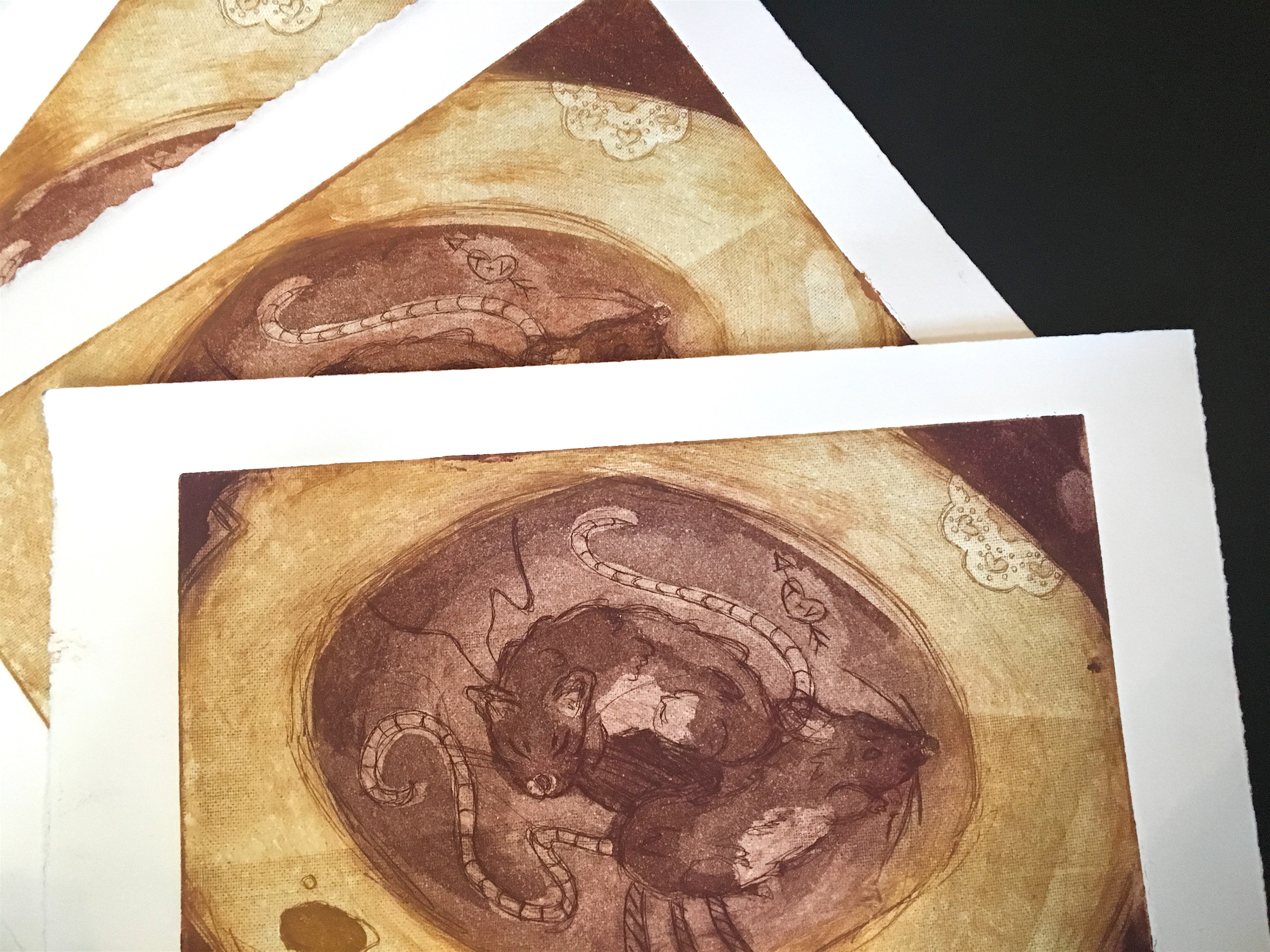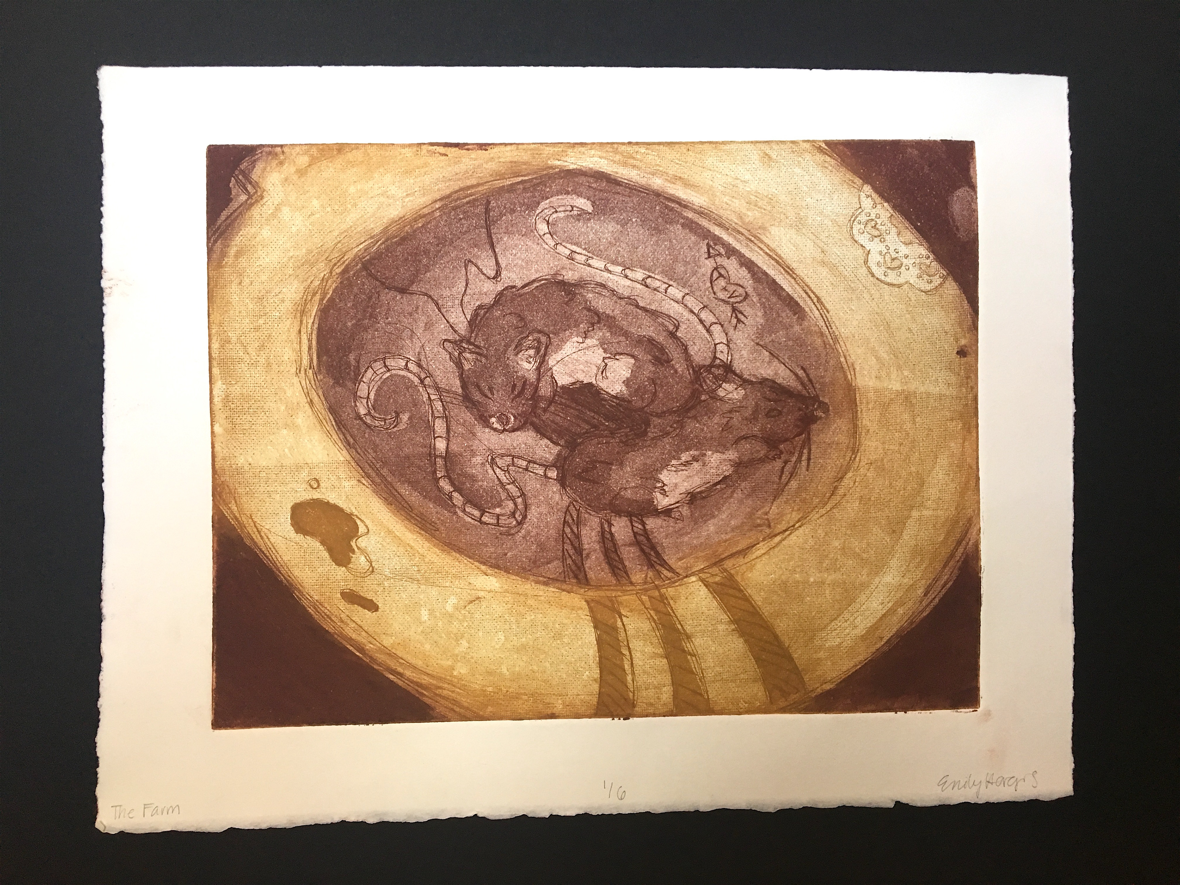 This muted color intaglio alludes to a forgotten farm where a young child had her first encounter with death. Upon lifting a toilet seat, the girl discovered two dead mice floating in the bowl. Their sweet, sleeping expressions lie still on their wet bodies. Edition of six. Intermediate Printmaking - Spring 2016